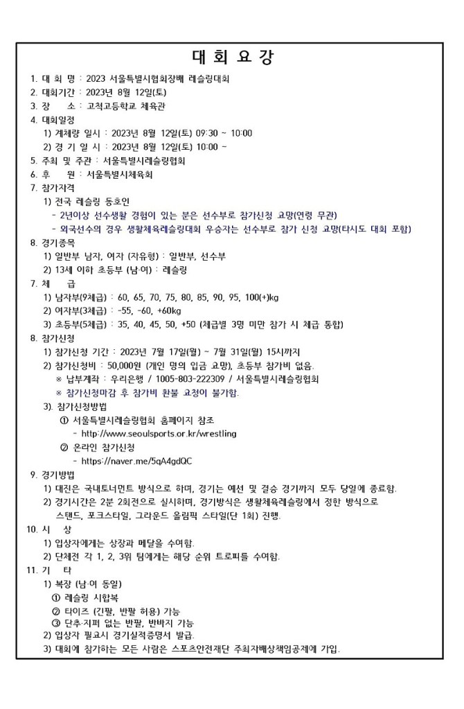 ※ 납부계좌 : 우리은행 1005-803-222309 서울특별시레슬링협회